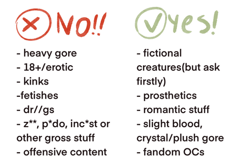 I won’t do any NSFW, erotic/fetish or offensive/illegal content. This includes mentions of dr//gs.